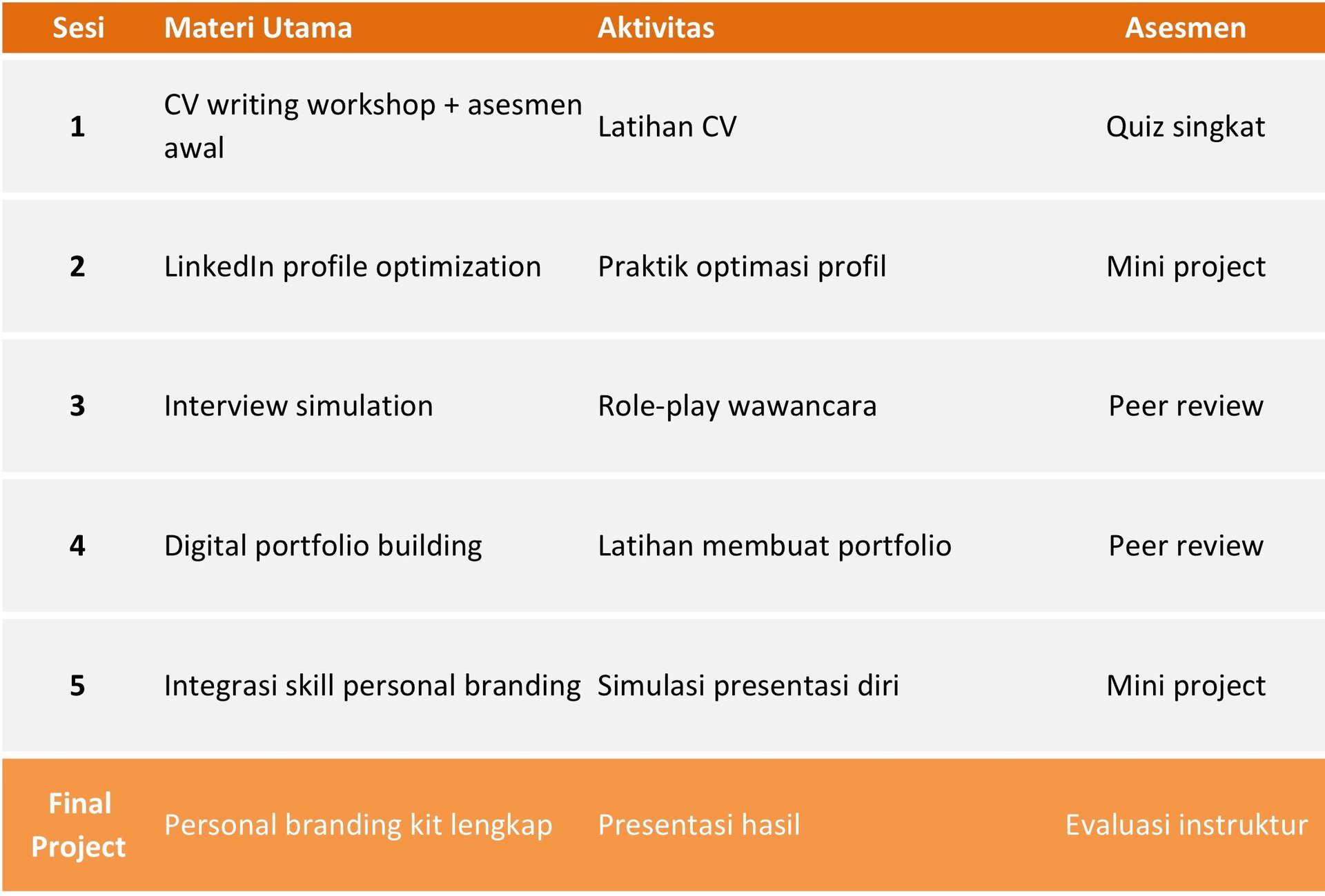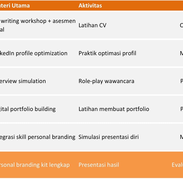 Peserta akan menguasai pembuatan CV, optimasi LinkedIn, strategi interview, dan portfolio digital.