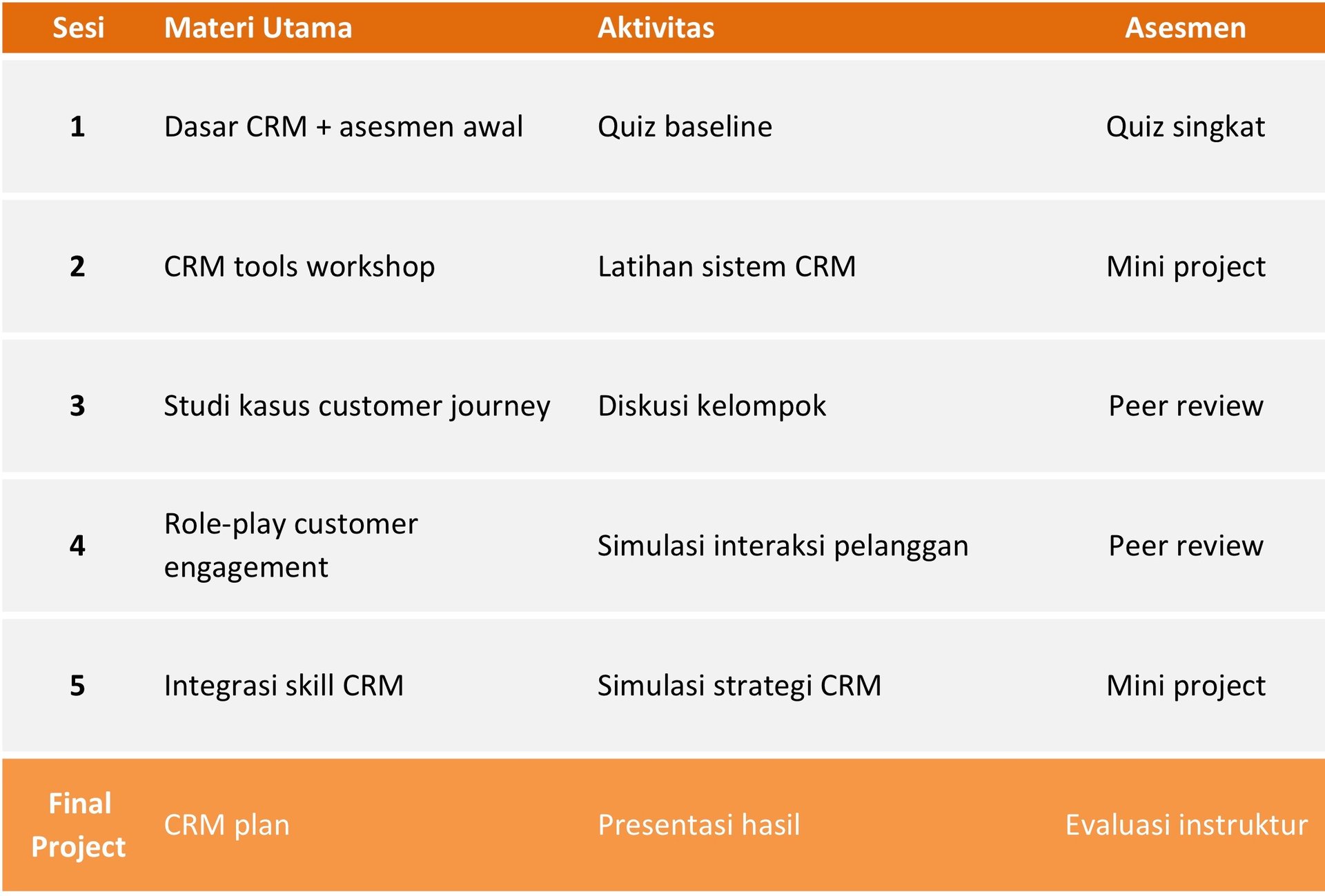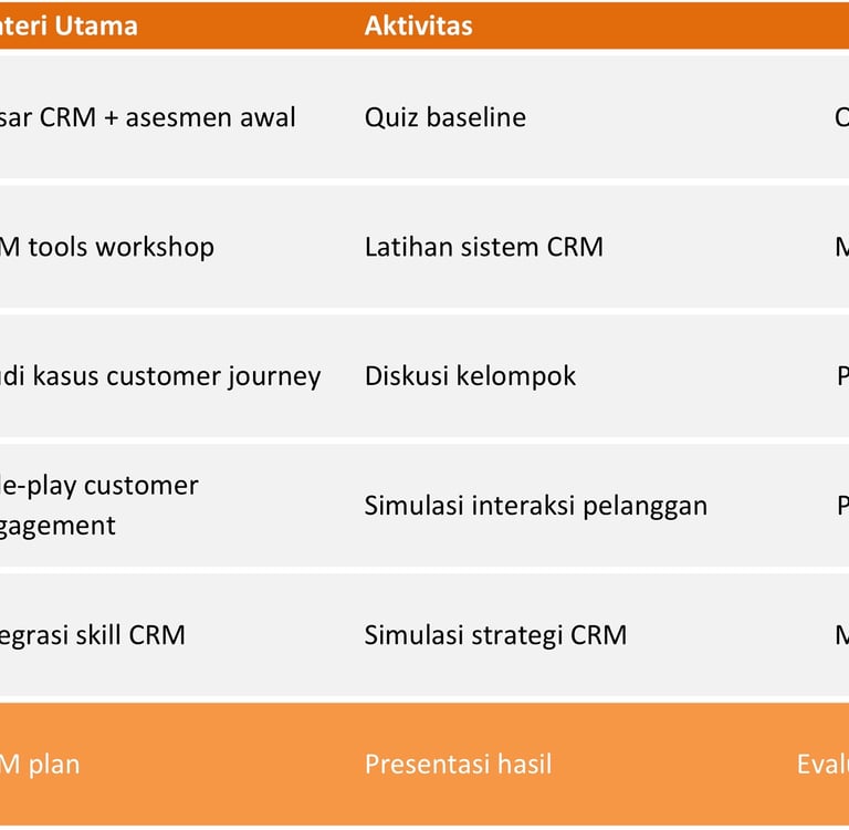 Peserta akan menguasai CRM tools, customer engagement, retention strategy, dan loyalty program.