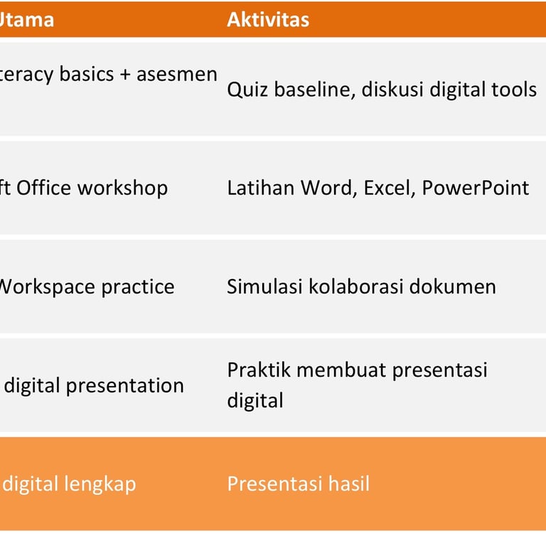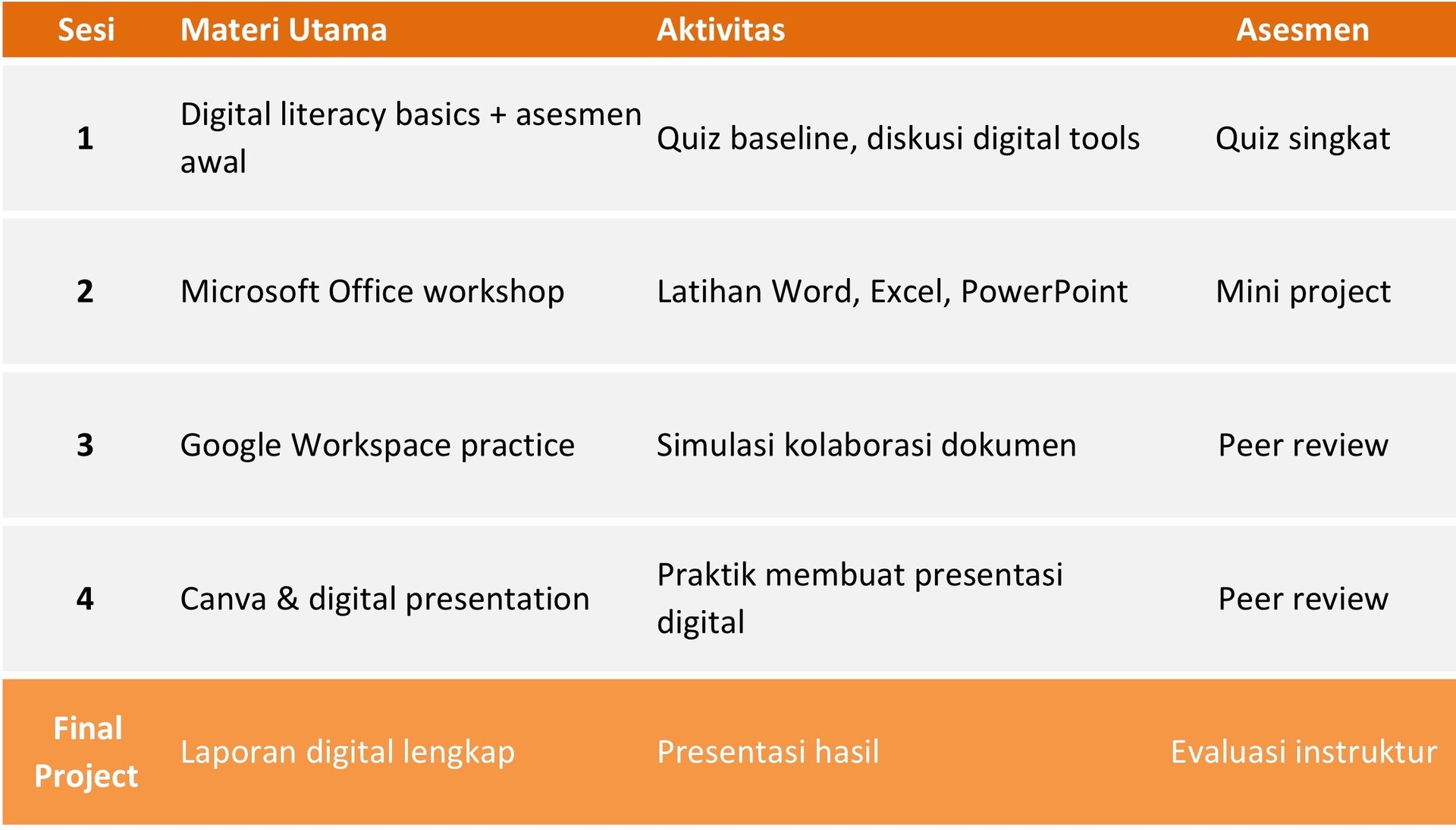 Peserta akan menguasai Microsoft Office (Excel, Word, PowerPoint), manajemen dokumen digital, serta kolaborasi online menggunakan platform seperti Teams atau Google Workspace.