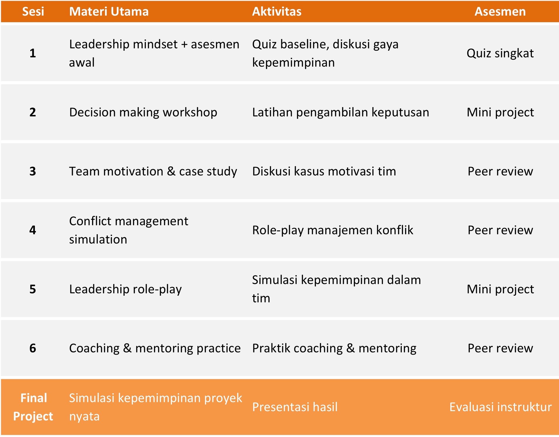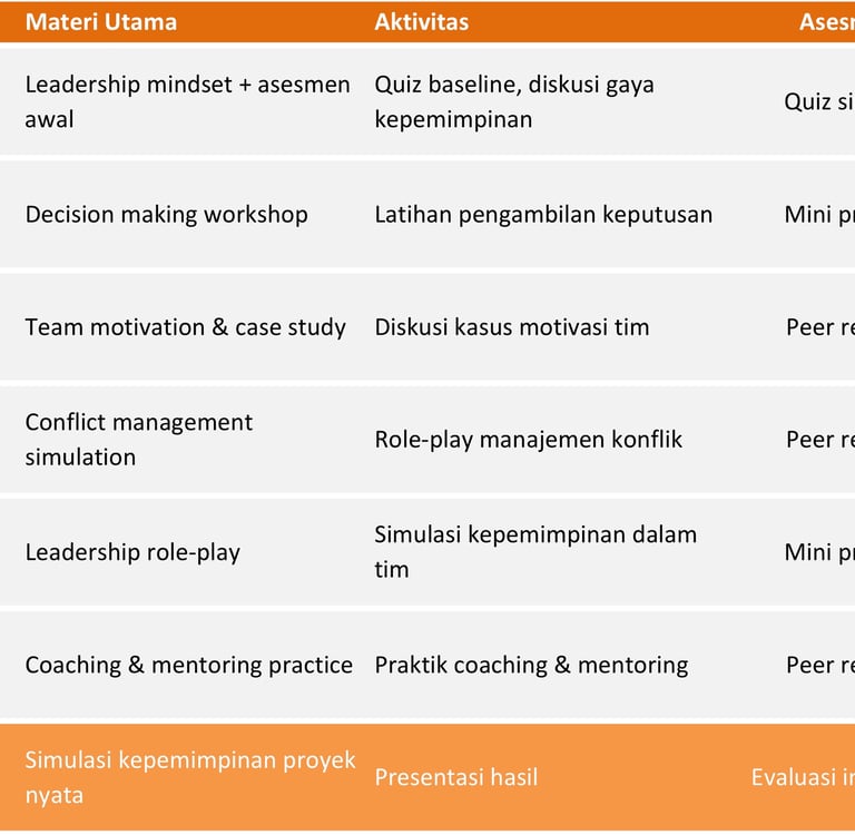 Peserta akan belajar leadership mindset, pengambilan keputusan strategis, dan motivasi tim. Kompetensi ini akan menjadikan Kamu pemimpin muda yang visioner, mampu menginspirasi tim, dan siap menghadapi tantangan organisasi.