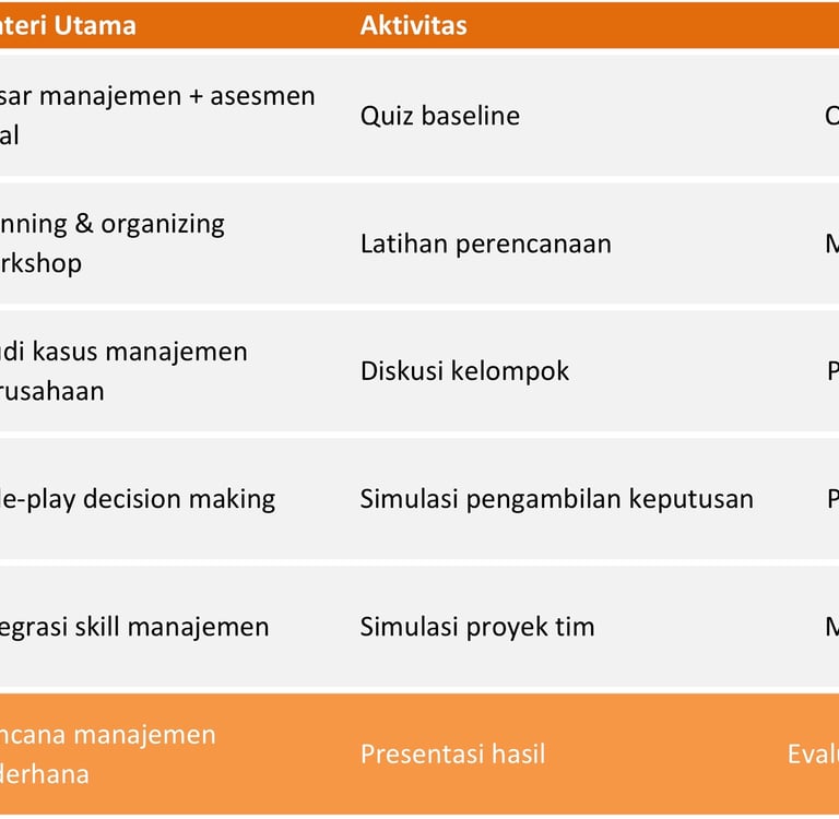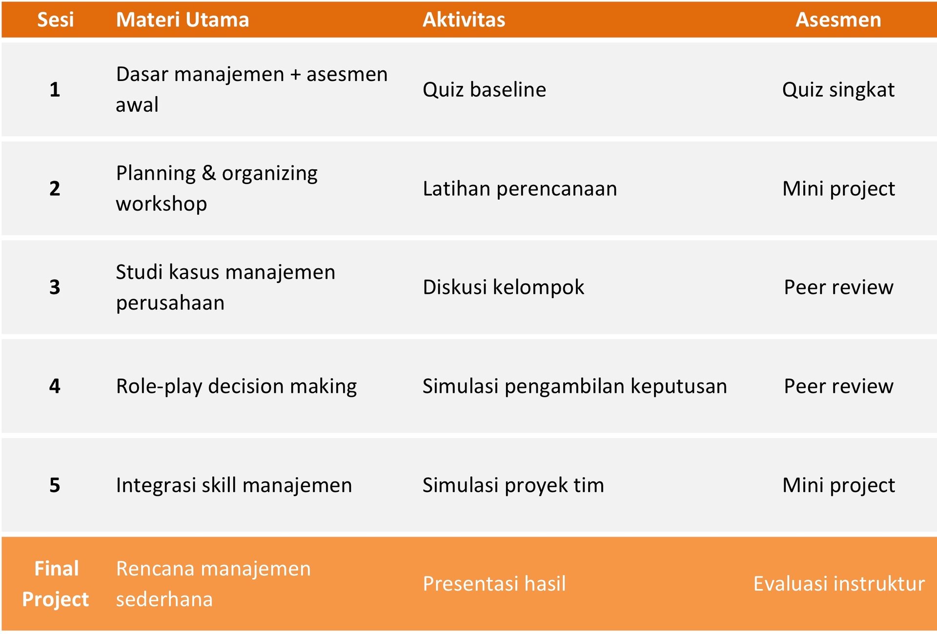 Peserta akan menguasai perencanaan, pengorganisasian, pengendalian, dan dasar kepemimpinan.