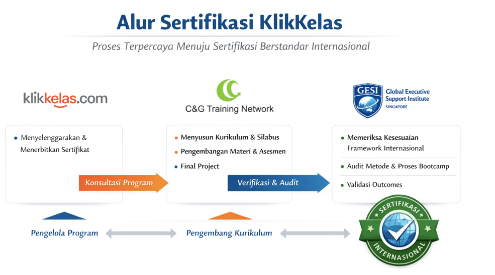 Sebelum program dipasarkan, setiap rancangan dari C&G diverifikasi oleh Global Executive Support Institute (GESI), lembaga independen yang memeriksa kesesuaian dengan international framework, metode pelaksanaan bootcamp, dan outcomes yang ditetapkan. Proses ini memastikan bahwa sertifikasi KlikKelas memiliki legitimasi internasional dan diakui oleh komunitas profesional global.