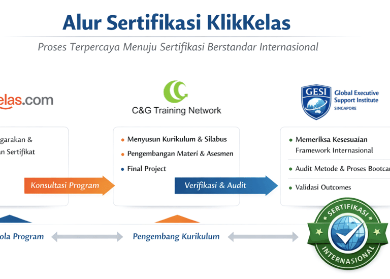 Setiap program KlikKelas dirancang oleh C&G Training Network dengan pengalaman lebih dari 20 tahun, dan diverifikasi oleh Global Executive Support Institute (Singapore) untuk memastikan kesesuaian dengan international framework. Sertifikat yang kamu terima bukan hanya bukti kelulusan, tetapi pengakuan kompetensi global yang membuka peluang karier lebih luas.
