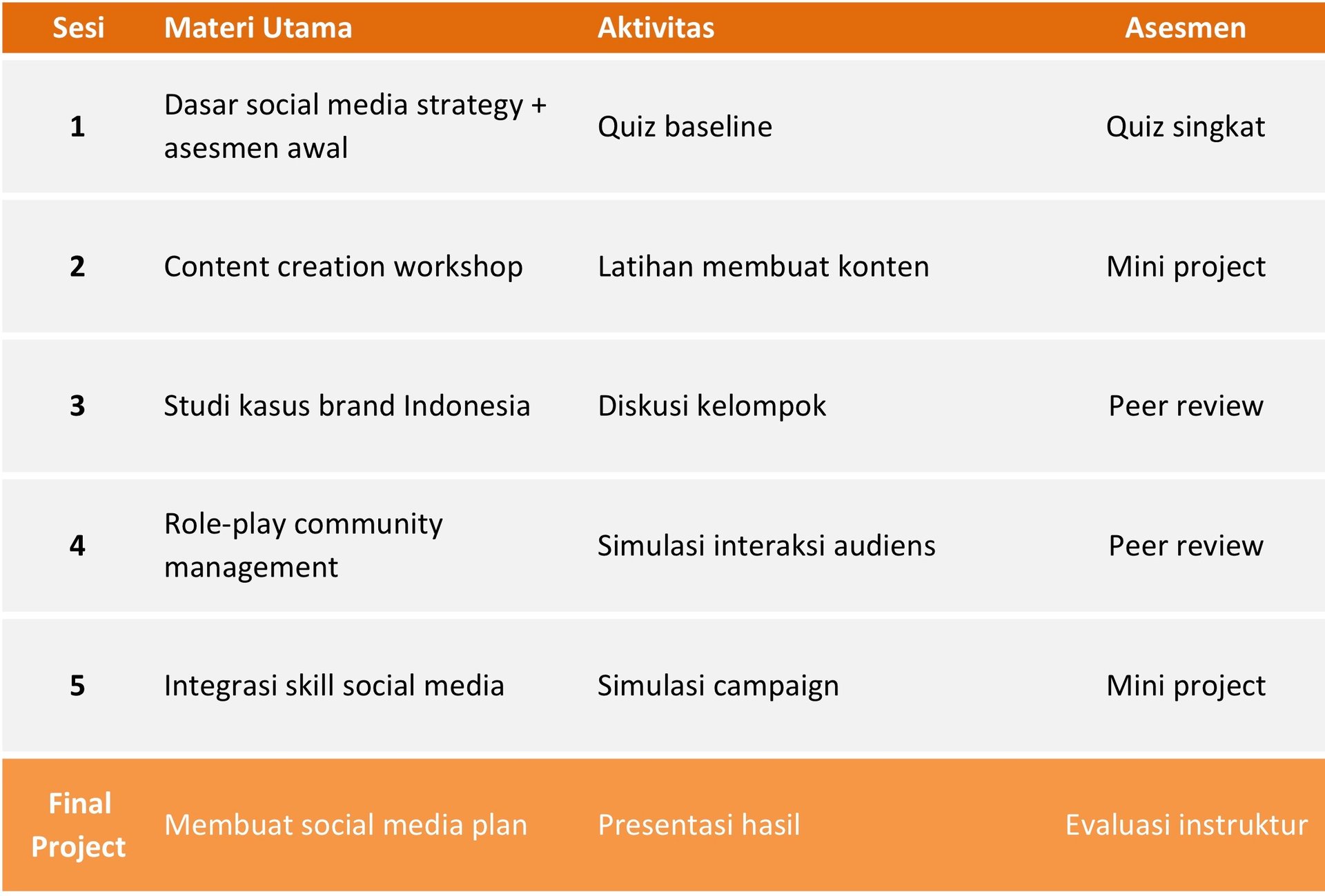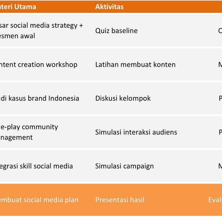 Peserta akan menguasai content creation, community management, social analytics, dan strategi engagement.