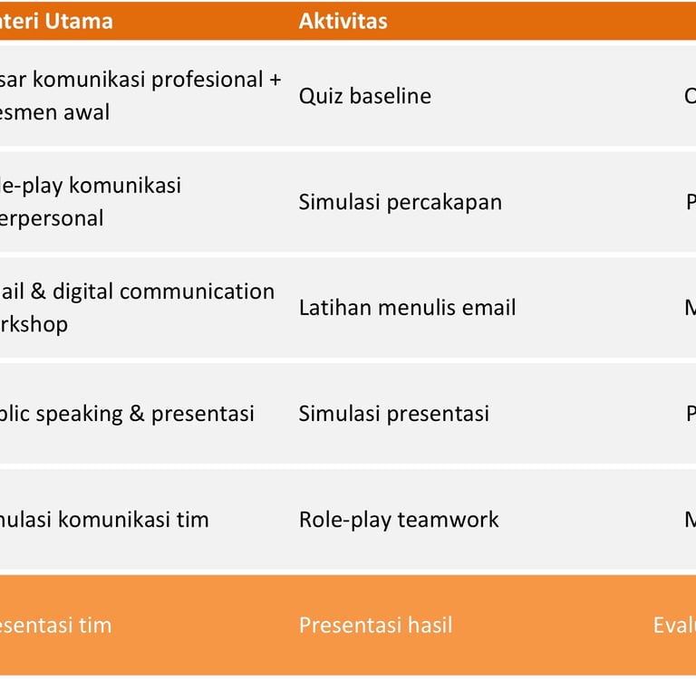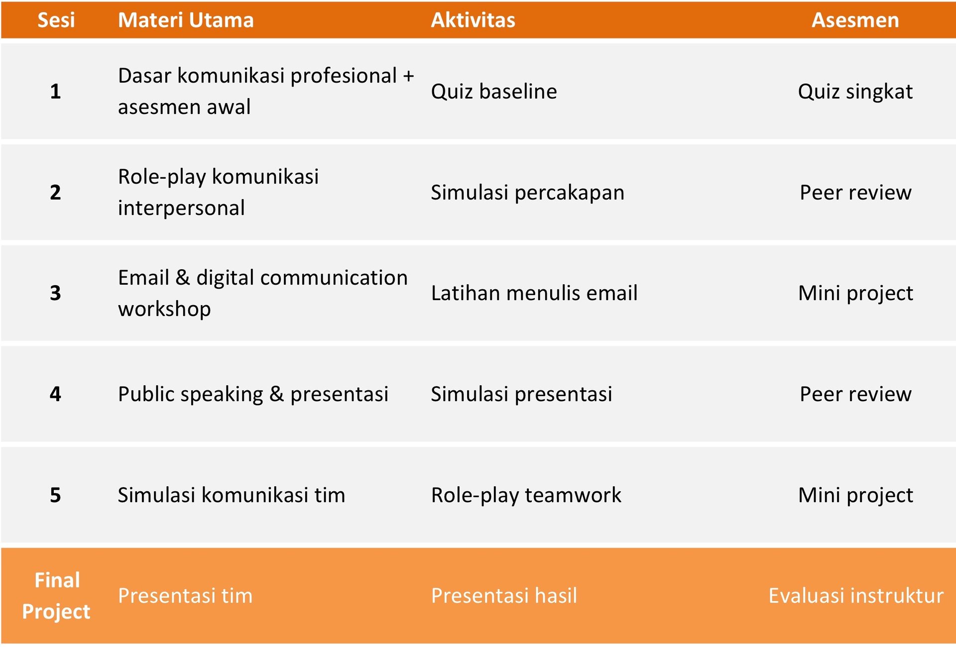 Peserta akan menguasai presentasi profesional, negosiasi, komunikasi lintas budaya, dan teamwork.